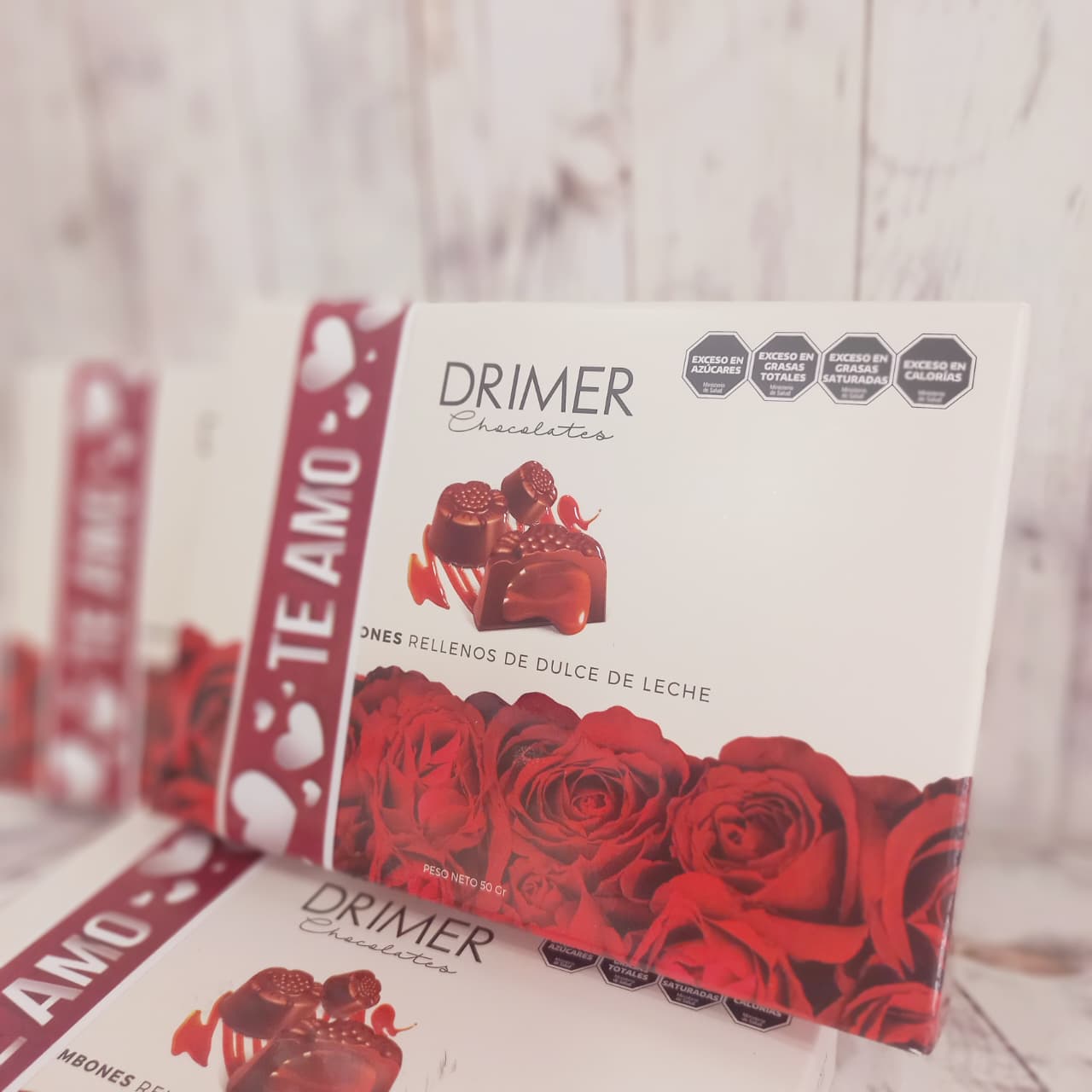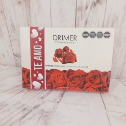 5 bombones de chocolate con leche rellenos de exquisito dulce de leche presentados en un estuche con delicadas rosas en su exterior